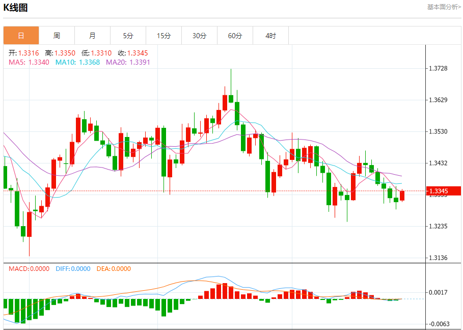 汇价高见1.3350,低见1.3310。上一交易日,汇价收于1.3311。