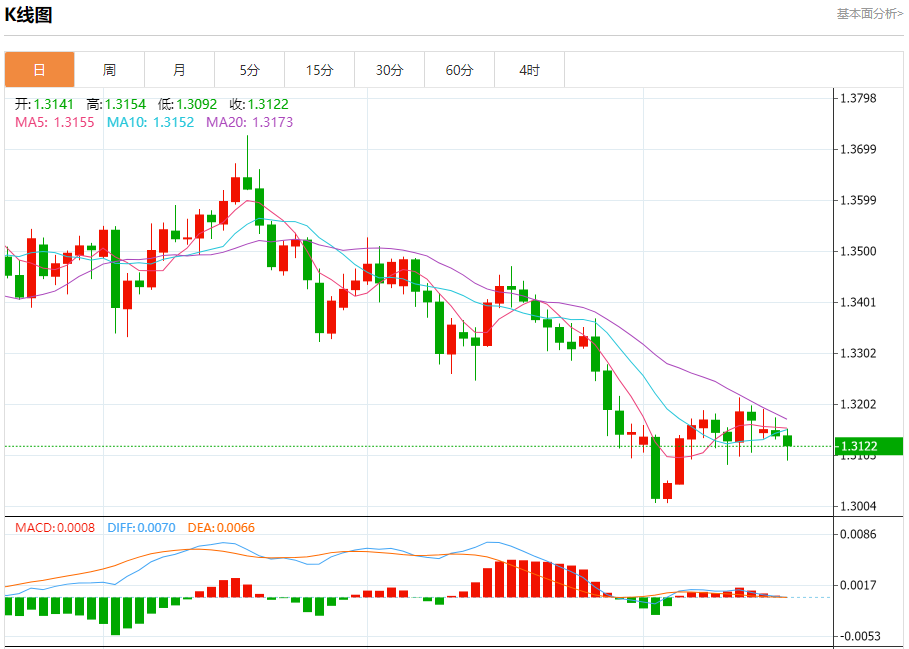 汇价高见1.3155,低见1.3093。上一交易日,汇价收于1.3144。