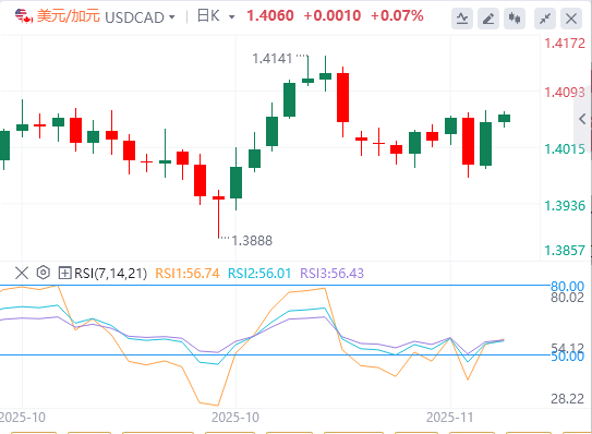 美元兑加元汇率可能瞄准1.4100心理水平,随后是11月5日达到的七个月高点1.4140。若进一步突破该水平,将使货币对测试上升通道的上界1.4210。