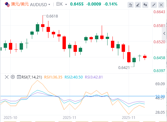澳元(AUD)因澳储银行可能采取谨慎立场而上涨。澳储银行11月会议纪要显示,央行可能会在较长时间内维持利率不变。ASX 30天银行间现金利率期货显示,截至11月20日,2025年12月合约交易为96.41,这意味着在即将召开的澳大利亚储备银行董事会会议上,利率从3.60%降至3.35%的概率为6%。
