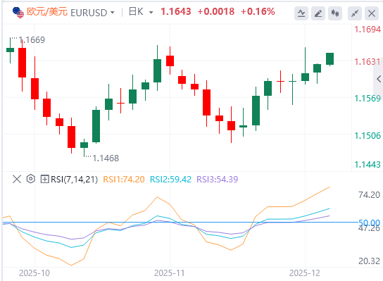 日线图中,欧元/美元报1.1635。价格守在1.1578的100-EMA上方,平均线正在上调,保持了复苏偏向。布林带收缩,价格略低于上轨,表明在波动性降低下持续存在多头压力。当前阻力位于上轨1.1652,初始支撑位于中轨1.1580。