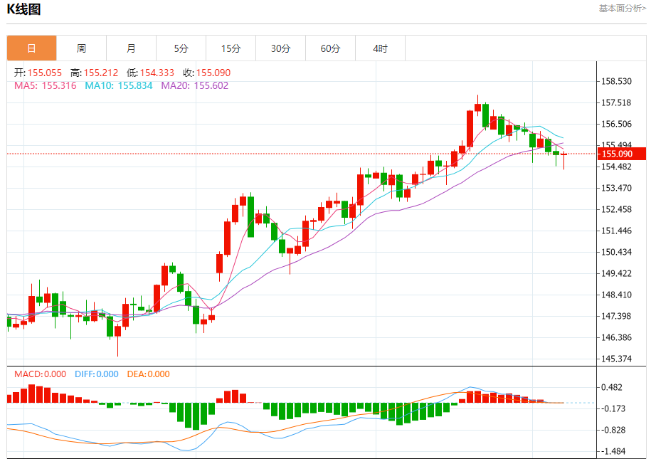 汇价高见155.223,低见154.342。上一交易日,汇价收于155.068。