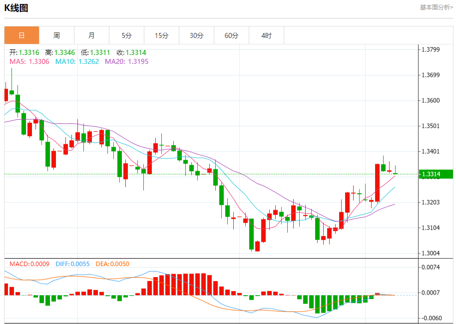汇价高见1.3346,低见1.3311。上一交易日,汇价收于1.3329。