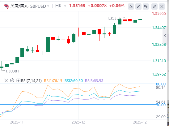 布林带在价格略低于上价带时有所收窄,显示波动性减弱,同时持续有买盘压力。初始支撑位于20天中线1.3410,紧接着是下1.3270。回调至中段将迎合买方需求,而跌破则可能暴露下限,减缓上升趋势的动能。