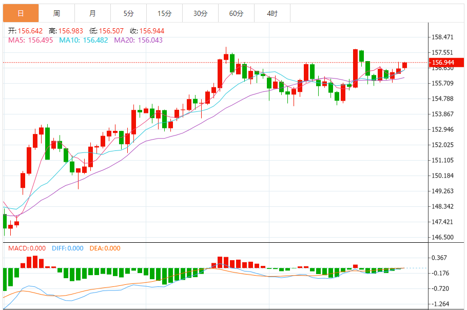 日线级别来看,美元/日元自2025年4月低位反弹以来,整体维持上行通道,当前汇价运行于5日、10日、20日等短期均线上方,均线系统呈多头排列,对汇价形成持续支撑。K线形态上,近期在156.00-157.20区间震荡整理,156.67枢轴点成为短期多空分水领,日内多次测试该位置后均获支撑反弹,显示短期偏强格局未改。