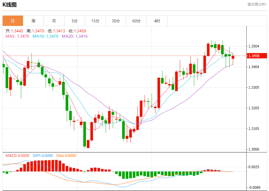 汇价高见1.3470,低见1.3413。上一交易日,汇价收于1.3457。
