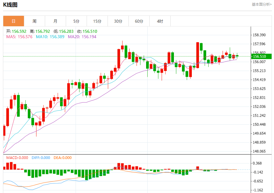 汇价高见156.792,低见156.283。上一交易日,汇价收于156.637。