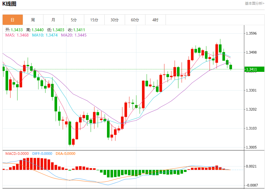 汇价高见1.3440,低见1.3403。上一交易日,汇价收于1.3435。
