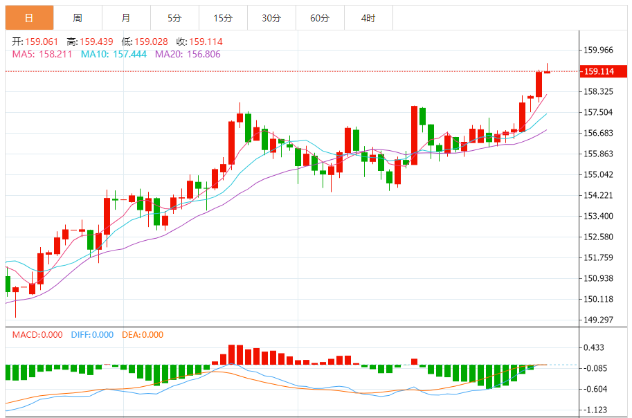 周三(1月14日),美元/日元上涨159.143,暂报159.114,涨幅0.02%。
