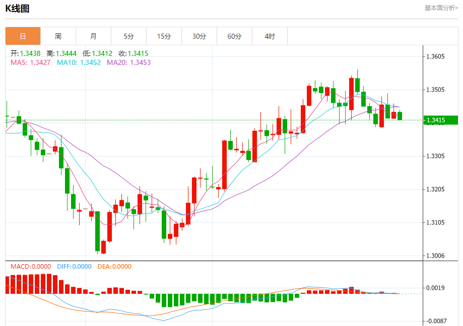 汇价高见1.3444,低见1.3412。上一交易日,汇价收于1.3439。