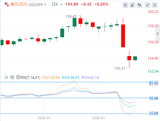 周一,美元兑日元在100日简单移动平均线(SMA)下方展现一定韧性,但仍低于154.75-154.80水平支撑断点。移动平均线收敛背离(MACD)直方图进一步延伸至负区间,表明MACD线低于信号线,且压力低于零时动能。相对强弱指数(RSI)为32(接近超卖),暗示下行空间可能被拉长。