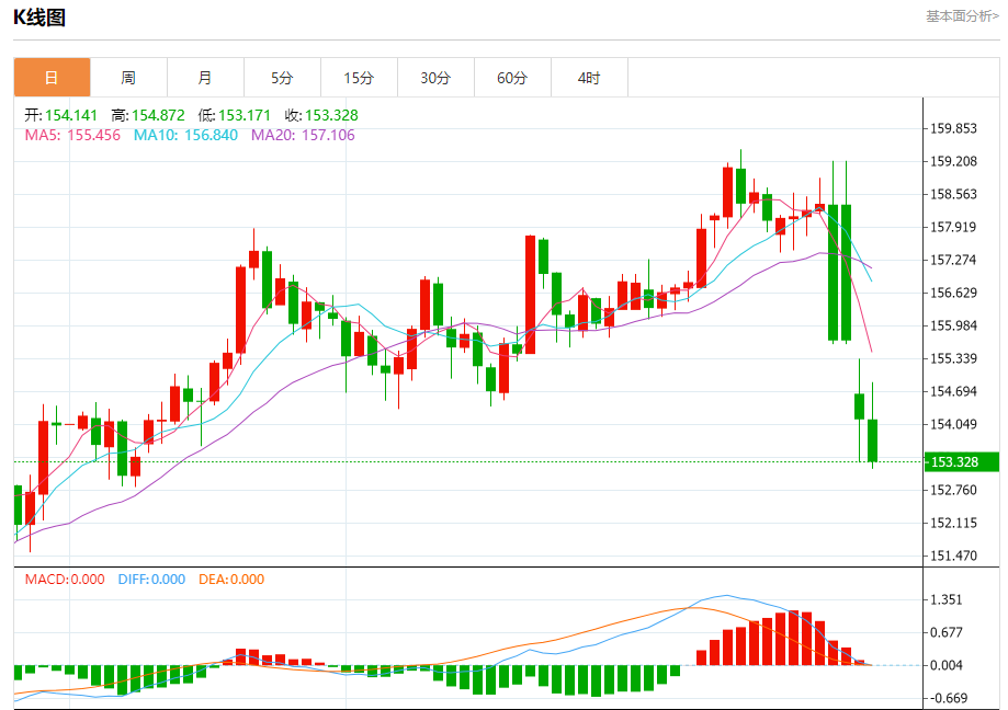 汇价高见154.872,低见153.171。上一交易日,汇价收于154.162。