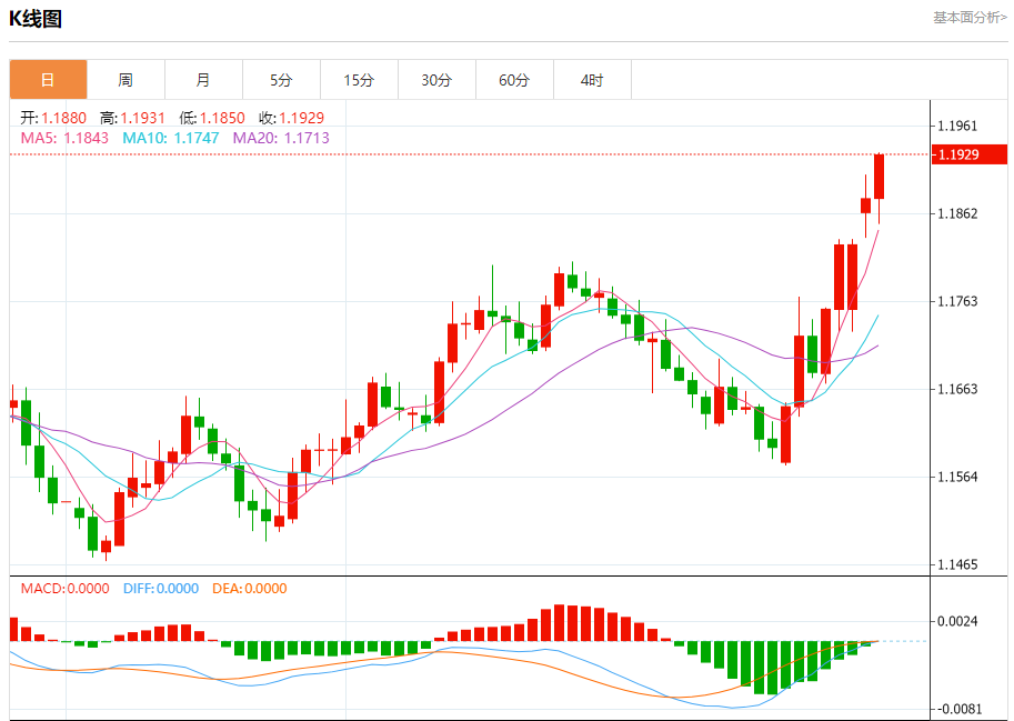 汇价高见1.1930,低见1.1850。上一交易日,汇价收于1.1879。