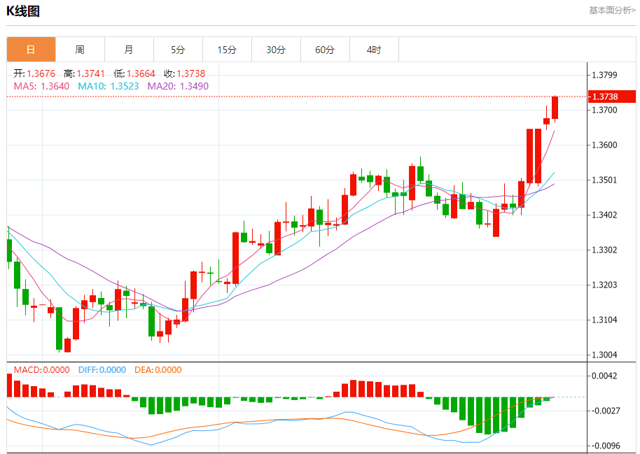 汇价高见1.3741,低见1.3664。上一交易日,汇价收于1.3676。
