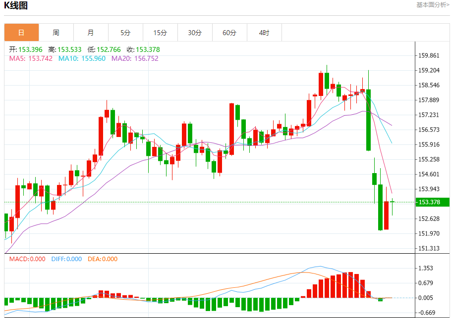 汇价高见153.533,低见152.766。上一交易日,汇价收于153.393。