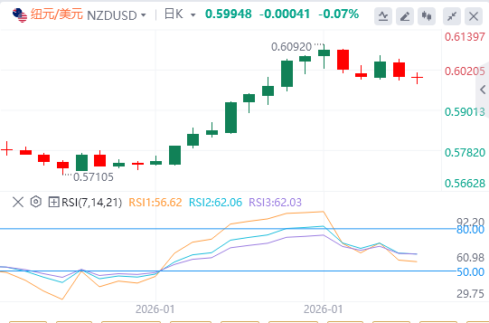 直接障碍位于九日均线0.5994。若短期均线上方反弹,将支持该货币对重返上升通道,目标为2025年7月记录的16个月高点0.6121。进一步上涨将引发纽元/美元对探索上升通道上界0.6270附近区域。