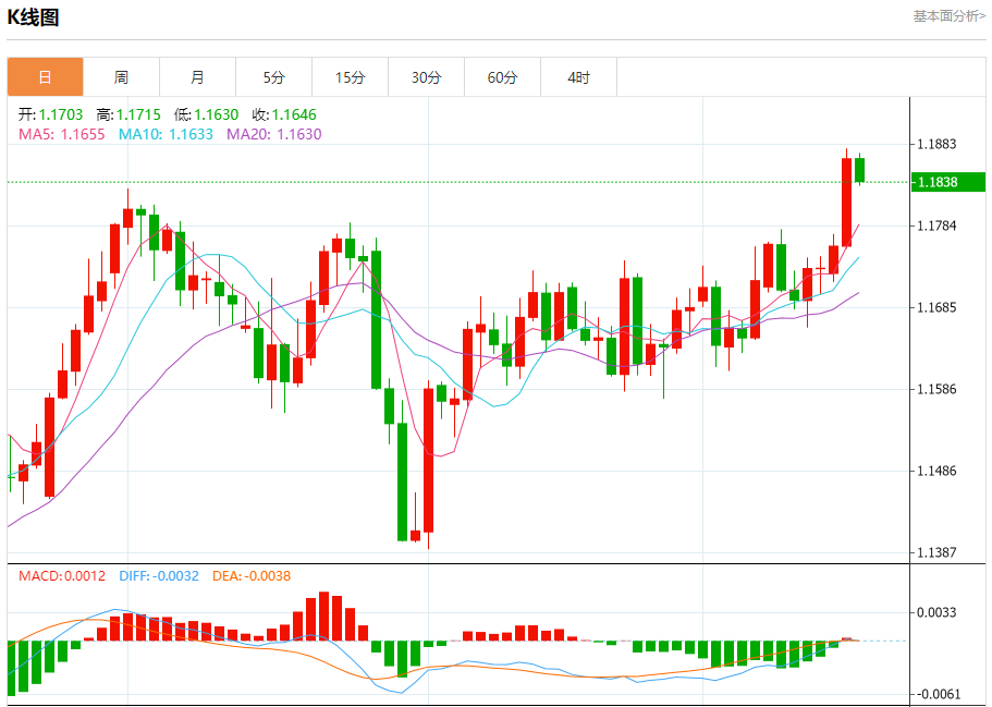 周三晚间,美元指数现报96.801,涨幅0.15%,现对美元兑欧元、英镑、日元主要货币对分析表述如下: 欧元/美元 汇价高见1.1872,低见1.1832。上一交易日,汇价收于1.1866。 日内建议:可以在1.1955---1.1830的区间下限买入,有效破位40个点止损,目标在区间的上限。 英镑/美元 汇价高