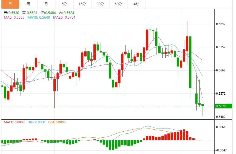 4月8日,周二亚市盘中,纽元/美元徘徊在0.5571附近。 纽元/美元周一下滑,纽元跌向0.5550区域。看跌情绪主导,货币对在0.5551和0.5798之间的更广泛区间内失去地盘,延续了与技术面走弱相一致的近期下跌。 从技术角度来看,该设置明显偏向看跌。移动平均趋同/背离(ACD)发出卖出信号,而相对强弱指数(RI)在38.01,显