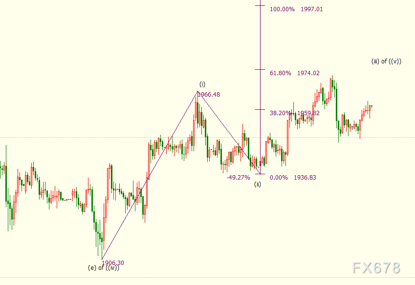 小时图上看,金价自1937美元开启动上行(iii)浪走势,目前在61.8%目标位1974美元下方附近受阻。(iii)浪的76.4%目标位在1983美元。(iii)浪是自1906美元开启的上行((v))浪的子浪。
