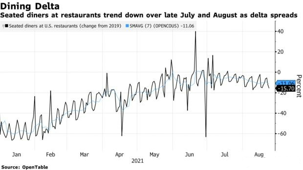 根据在线订餐网站Open Table的数据,最近几周,美国餐厅的就座用餐量比2019年的水平低了约10-11%,而在7月底,就座用餐量仅比2019年的水平低5-6%。该公司表示,就餐人数的下降与人们对delta毒株的担忧以及当地政府的隔离措施有关。