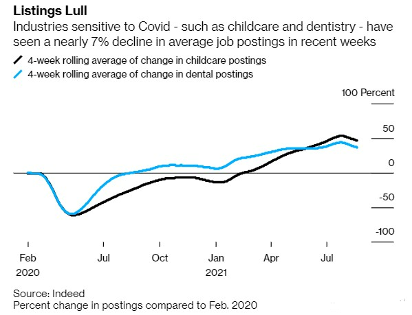 尽管今年劳动力市场变得更加紧张,许多雇主说他们正在努力填补职位空缺,但有一些迹象表明,受delta毒株影响,劳动力需求正在放缓。例如,Indeed网站上的牙科诊所和儿童护理职位的招聘数量有所下降,这些职位需要与公众密切接触。
