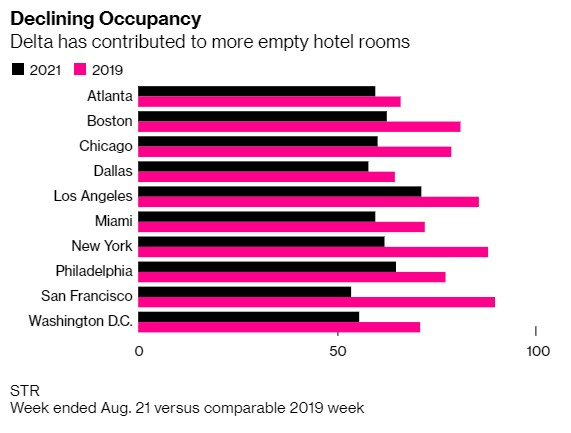 STR发现,在美国25个大城市中,没有一个城市的截至8月21日当周的入住率与2019年同期相比有所增加。旧金山的入住率下降了40%以上,是25个大城市的最大跌幅。