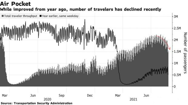 根据美国运输安全管理局的数据,周二,有147万名旅客乘坐航班,是三个多月来的最低水平。8月底,7日平均客流量从一个月前的205万人次降至176万人次左右。