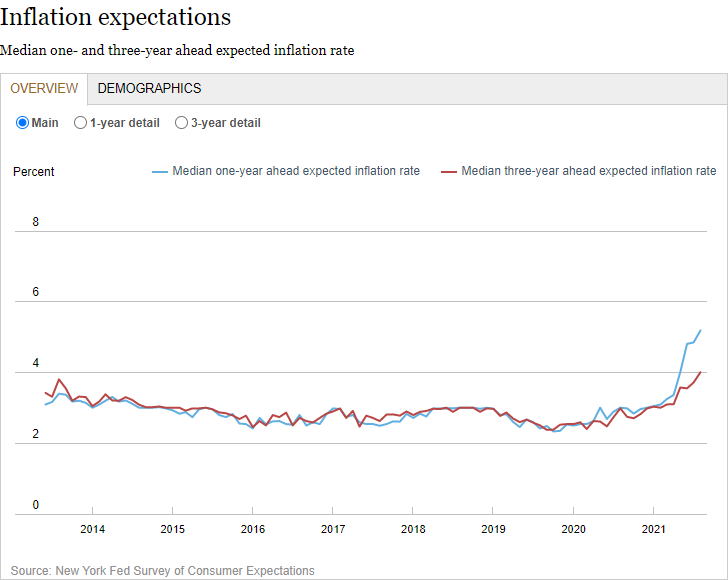 对1300个家庭调查的数据显示,8月份美国消费者对未来一年的通胀预期上升至5.2%的中值,为连续第10个月走高;未来三年的通胀预期上升至4.0%。该调查于2013年启动,两项指标均创下有史以来的最高水平。