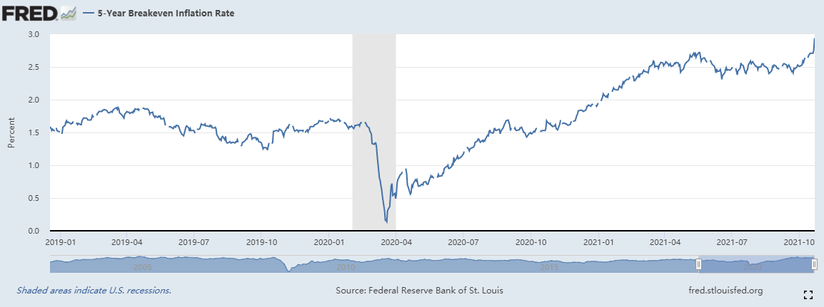 10月22日,美国5年期盈亏平衡通胀率攀升逾9个基点至3.007%,有纪录以来首次突破3%,远超美联储2%的长期通胀目标。
