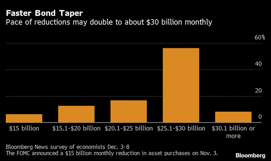 利率期货市场押注到明年年底加息约66个基点。超半数经济学家预计,联邦公开市场委员会(FOMC)将从1月开始加倍减码,每月降低300亿美元,到3月结束购债行动。美国经济研究专家David Wilcox表示: