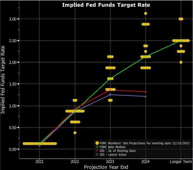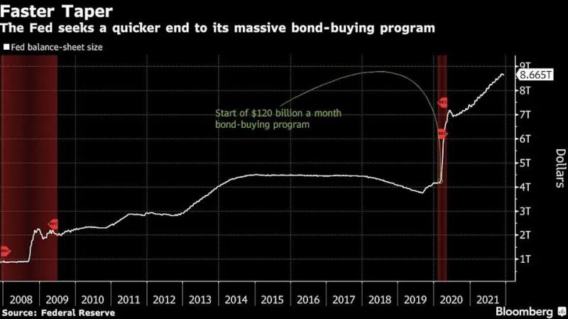 美联储在上周的利率决议上决定将减码债券购买的步伐提高一倍,从而使资产购买计划有望在3月中旬前结束。他们还暗示,预计基准联邦基金利率明年上调三次可能是合适的。