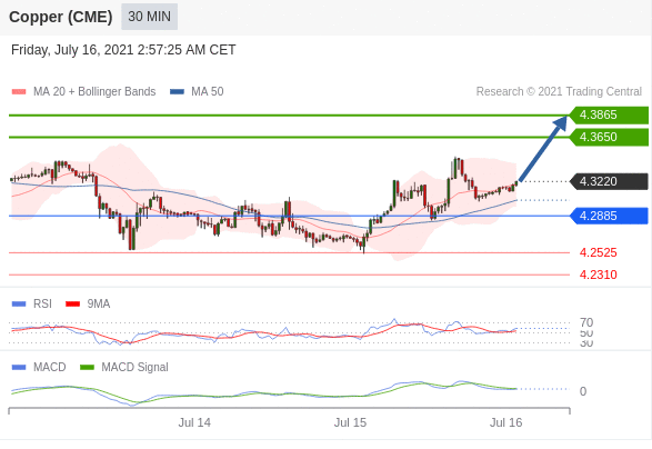 看涨,当4.2885为支撑位,目标定在4.3865。 转折点为:4.2885 交易策略:看涨,当4.2885为支撑位,目标定在4.3865。 备选策略:向下跌破4.2885,将带来继续下跌的趋势,目标位为4.2525然后为4.2310。 技术点评:RI技术指标超过50。ACD技术指标处在其信号线之下看多。此外,价位高于其20个时期及50个时期移动平均线(分别位