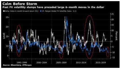根据彭博新闻社的计算,1996年汇率波动低谷之后,美元上涨超过10%,然后2014年的平静期之后,美元在接下来的六个月内上涨超过15%。2007年波动性暴跌,然后美元汇率下跌超过10%。