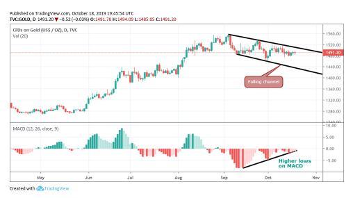 文章显示,从日线图上可以看出,金价自9月初以来一直处于下跌通道。但MACD低点不断抬高,暗示看空动能正在减弱。因此,金价看上去势必会挑战看空通道的上边缘,目前在1510美元/盎司。假如金价收盘位于上述水平上方,将暗示看涨突破,并恢复自5月时1270美元/盎司附近低点的反弹走势。届时,金价可能会挑战1557美元/盎司的阻力位(2019年的高点)。