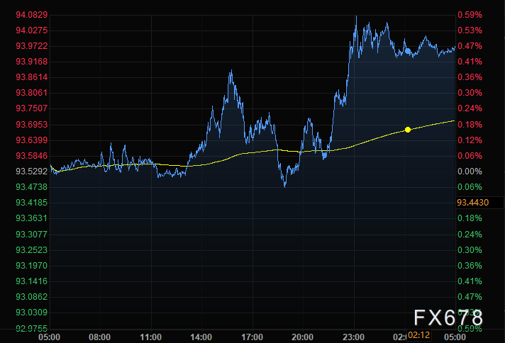 美元周二升至八周高位,最高触及94.09,目前交投于93.98附近,此前美联储一名高级官员在提到加息前景时语气偏鹰派,令投资者已经存在的避险情绪加深。