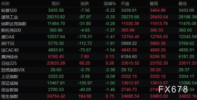 美股三大指数小幅收跌,道琼斯指数收盘下跌98.00点,跌幅0.35%,报28210.82点;标普500指数收盘下跌7.60点,跌幅0.22%,报3435.55点;纳斯达克指数收盘下跌31.80点,跌幅0.28%,报11484.69点。