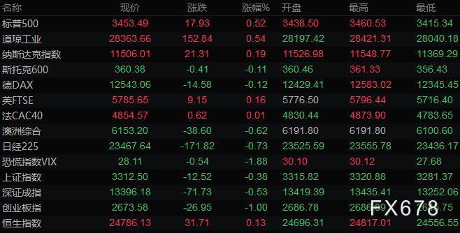 美股三大指数集体收涨,标普500指数收盘上涨17.90点,涨幅0.52%,报3453.49点;纳斯达克指数收盘上涨21.30点,涨幅0.19%,报11506.01点;道琼斯指数收盘上涨152.80点,涨幅0.54%,报28363.66点。