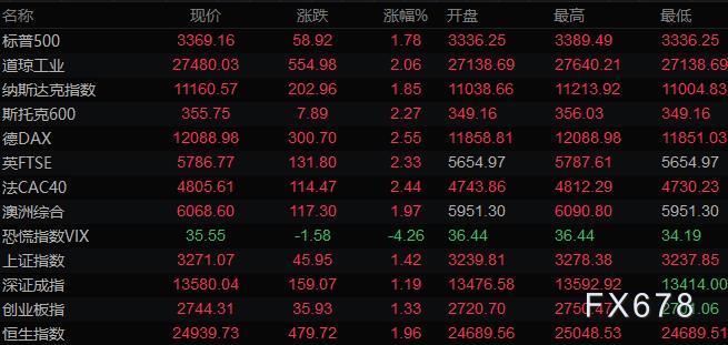 美股三大指数全线收涨,道琼斯指数收盘上涨555.00点,涨幅2.06%,报27480.03点;标普500指数收盘上涨58.90点,涨幅1.78%,报3369.16点;纳斯达克指数收盘上涨203.00点,涨幅1.85%,报11160.57点。