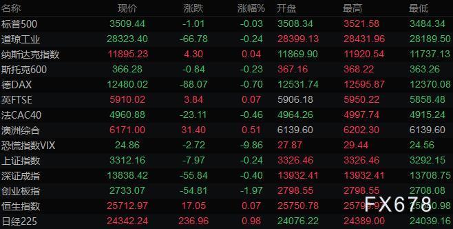 美股三大指数收盘涨跌不一,标普500指数收盘下跌1.00点,跌幅0.03%,报3509.44点;纳斯达克指数收盘上涨4.30点,涨幅0.04%,报11895.23点;道琼斯指数收盘下跌66.80点,跌幅0.24%,报28323.40点。