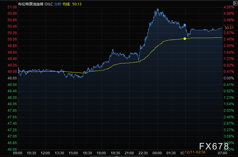 布伦特原油期货上涨1.39美元,收于每桶50.25美元,涨幅2.8%,连续第三天上涨,盘中最高涨幅约4.5%。美国原油期货上涨1.26美元,收于每桶46.78美元,涨幅2.8%,盘中最高涨幅约4.8%。