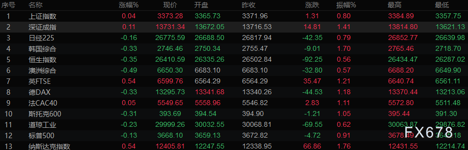 道琼斯工业指数下跌0.23%,至29999.26点。标普500指数收低0.13%,至3668.1点。纳斯达克指数上涨0.54%,至12405.81点。