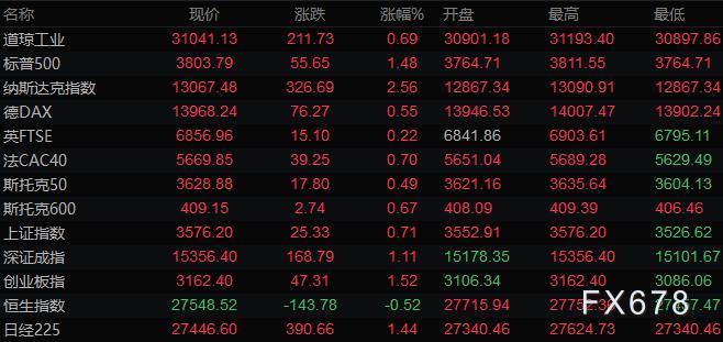 美股三大指数收盘齐创新高,标普500指数收盘上涨55.70点,涨幅1.48%,报3803.79点;纳斯达克指数收盘上涨326.70点,涨幅2.56%,报13067.48点;道琼斯指数收盘上涨211.70点,涨幅0.69%,报31041.13点。