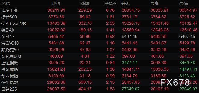 美股三大指数高开高走,道琼斯指数收盘上涨229.30点,涨幅0.76%,报30211.91点;标普500指数收盘上涨59.60点,涨幅1.61%,报3773.86点;纳斯达克指数收盘上涨332.70点,涨幅2.55%,报13403.39点。