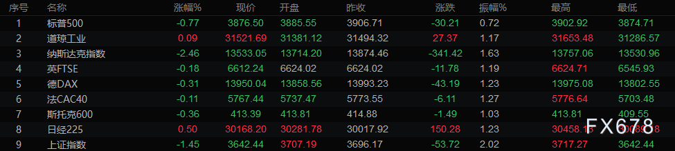 美国股市方面,标普500指数下跌0.8%,报3876.50点;道琼斯工业平均指数上涨0.1%,报31521.69点;纳斯达克综合指数下跌2.5%,报13533.05点。
