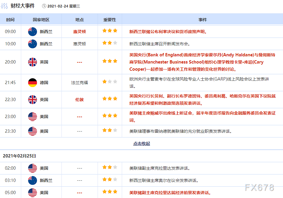 周三(2月24日)亚市盘初,市场暂时波动不大。周二美联储主席鲍威尔的国会证词如期鸽派,确认经济复苏前景并缓解了通胀升温的担忧,金价虽然走弱,但目前仍坚守住1800关口上方;美原油价格周二小幅下跌,因为在经过本月的强劲上涨之后,技术指标显示价格面临回落风险。API原油库存意外增加,也令油价承压。