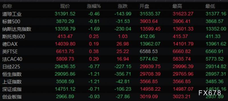 美股三大指数全部收跌,道琼斯指数收盘下跌144.12点,跌幅0.46%,报31391.39点;标普500指数收盘下跌31.53点,跌幅0.81%,报3870.29点;纳斯达克综合指数收盘下跌230.04点,跌幅1.69%,报13358.79点。