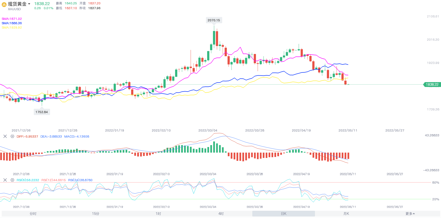 20:30,美国4月未季调CPI年率。市场预计美国4月CPI数据将从上个月的8.5%降至8.1%,如果数据录得与预期一致,这将是2020年新冠疫情以来CPI首次出现最具市场意义的下滑。通胀见顶的预期或降低美联储进一步激进加息的迫切性。
