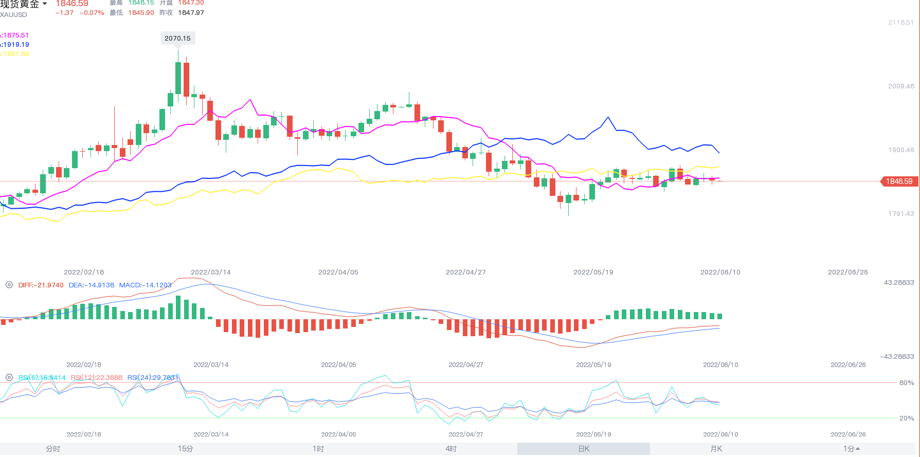 现货黄金周四震荡下行,盘中一度下探1840美元,收跌0.28%,报1848.04美元/盎司;现货白银美盘时段大幅下挫,收跌1.57%,报21.69美元/盎司。