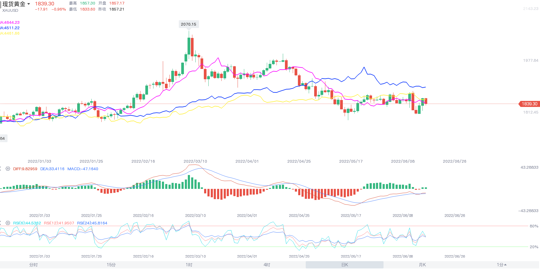 上周五,现货黄金在亚盘触及1857.54的高点后震荡下行,收跌0.93%,报1839.35美元/盎司;现货白银于美盘时段跳水,最终收跌1.25%,报21.65美元/盎司。
