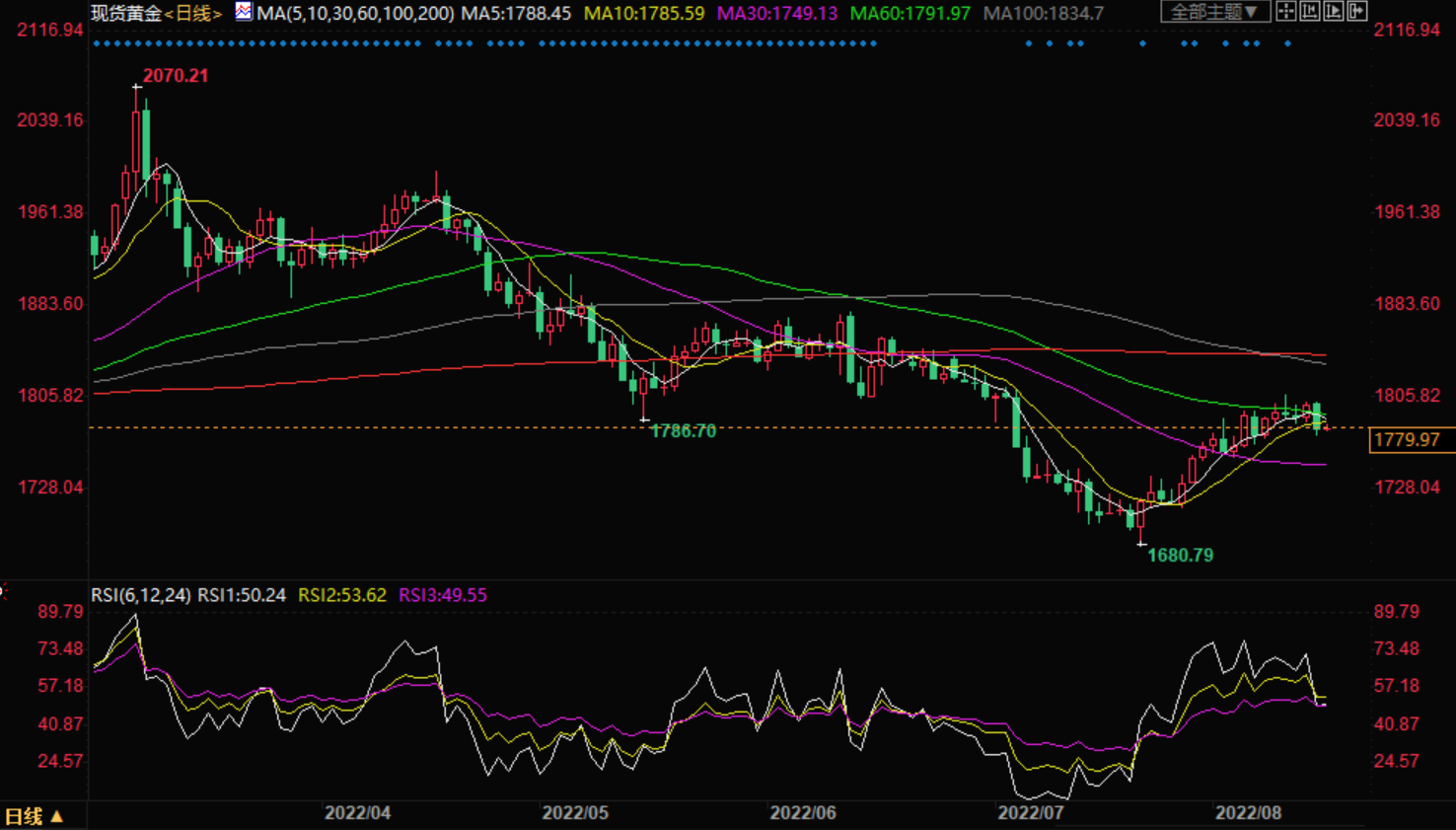 技术面:MACD近期上升之际,金价自8月3日至10日波段的61.8%斐波回档位修正回调。不过金价反弹需要来自8月9日以来支撑线以及200小时MA均线的印证才能唤醒黄金兑美元多头,它们分别位于1783美元和1785美元。